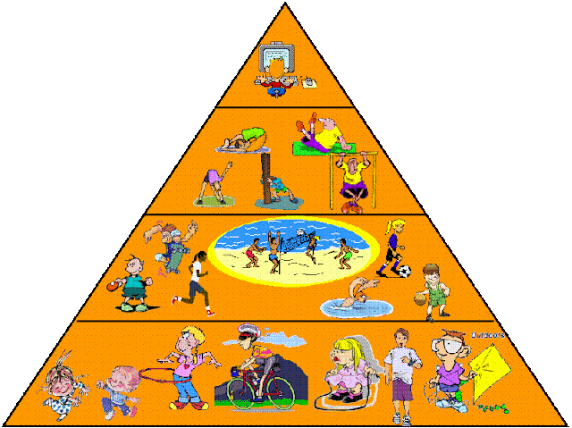 Στη βάση της πυραμίδας, δηλαδή στο πρώτο επίπεδο, βρίσκονται οι καθημερινές δραστηριότητες (όπως βόλτα με το ποδήλατο - καθαριότητα σπιτιού - ανέβασμα της σκάλας - πλύσιμο αυτοκινήτου – γρήγορο περπάτημα – δουλειά στον κήπο – χορός – παιχνίδι στη γειτονιά ή στο πάρκο ) που είναι απαραίτητες όσο το δυνατόν συχνότερα, δηλαδή σε καθημερινή βάση.