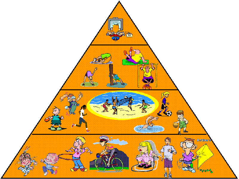 Στη βάση της πυραμίδας, δηλαδή στο πρώτο επίπεδο, βρίσκονται οι καθημερινές δραστηριότητες (όπως βόλτα με το ποδήλατο - καθαριότητα σπιτιού - ανέβασμα της σκάλας - πλύσιμο αυτοκινήτου – γρήγορο περπάτημα – δουλειά στον κήπο – χορός – παιχνίδι στη γειτονιά ή στο πάρκο ) που είναι απαραίτητες όσο το δυνατόν συχνότερα, δηλαδή σε καθημερινή βάση.