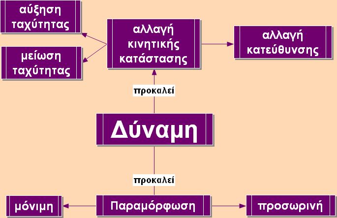 Όταν σε ένα σώμα ασκείται δύναμη, τότε μπορεί να προκληθεί:- Αλλαγή στην ταχύτητα του σώματος που μπορεί να είναι ή αύξηση ή μείωση της ταχύτητας ΚΛΙΚ